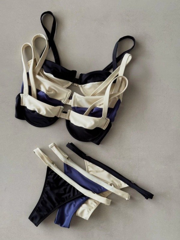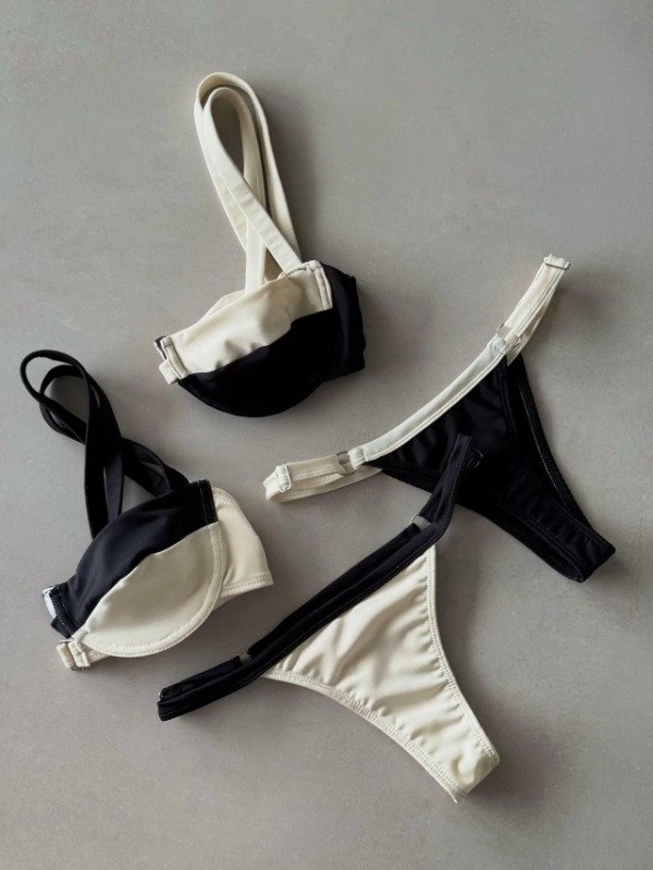 Bikini con aro, forrada, combinada. Breteles fijos a la espalda con elástico, prende con broche metálico. Sostiene y levanta a la perfeccion.